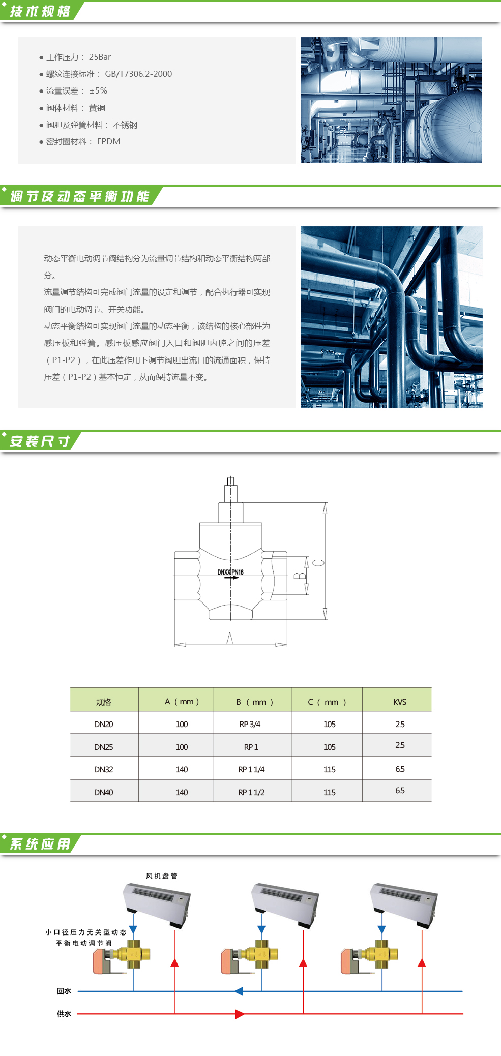 本系列產(chǎn)品集動(dòng)態(tài)平衡與調(diào)節(jié)功能于一體,根據(jù)流量需求調(diào)整好閥門開度,無(wú)論系統(tǒng)壓差如何波動(dòng),只要在閥門的工作范圍內(nèi),閥芯即可自動(dòng)調(diào)整可變流道開度,保持流量恒定不變。該閥門采用新穎獨(dú)特的剛性結(jié)構(gòu),徹底克服老舊膜片式閥門的壽命短、調(diào)節(jié)范圍小等缺點(diǎn)。精確校準(zhǔn)的閥芯可確保恒定在±5%的偏差范圍內(nèi)。通過(guò)動(dòng)態(tài)平衡功能動(dòng)態(tài)平衡系統(tǒng)的阻力,保證設(shè)備輸送介質(zhì)流量在一定壓差范圍內(nèi)不受系統(tǒng)壓力波動(dòng)影響,保持恒定。根據(jù)設(shè)備的輸入信號(hào),執(zhí)行器改變閥門開度,實(shí)現(xiàn)閥門的調(diào)節(jié)和開關(guān)功能。