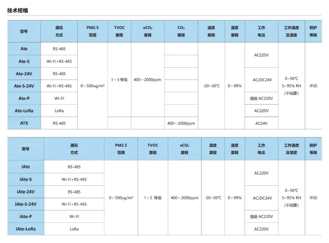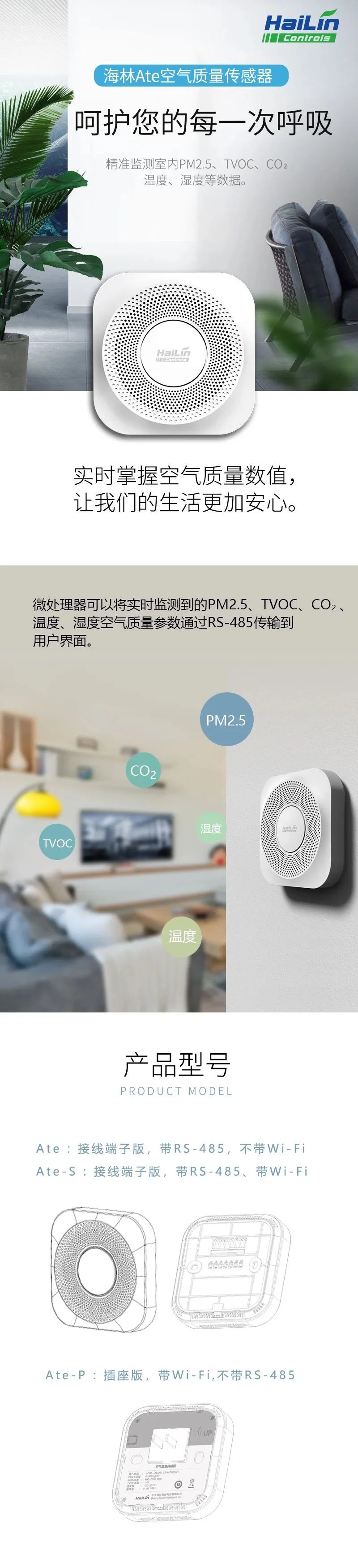 海林Ate 是一款五合一的空氣質量傳感器,用于室內多種空氣參數的測量,包括溫度、濕度、PM2.5、CO?/eCO? 和 TVOC。配備 Wi-Fi、RS-485、LoRa 或 ZigBee 等多種通訊方式, 適用于各種樓宇自控系統。