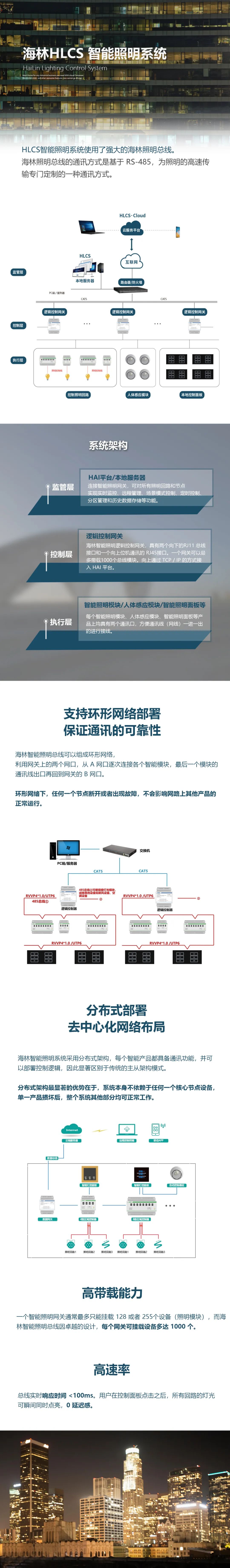 海林智能照明系統因高速率、帶載能力高、穩定性強的特點,得到了大多數在酒店、辦公及住宅項目中的應用。尤其是當項目的照明系統非常龐大時,對照明控制器的監控管理非常繁瑣的情況,海林總線控制、分區部署的智能照明系統的優勢更加明顯。