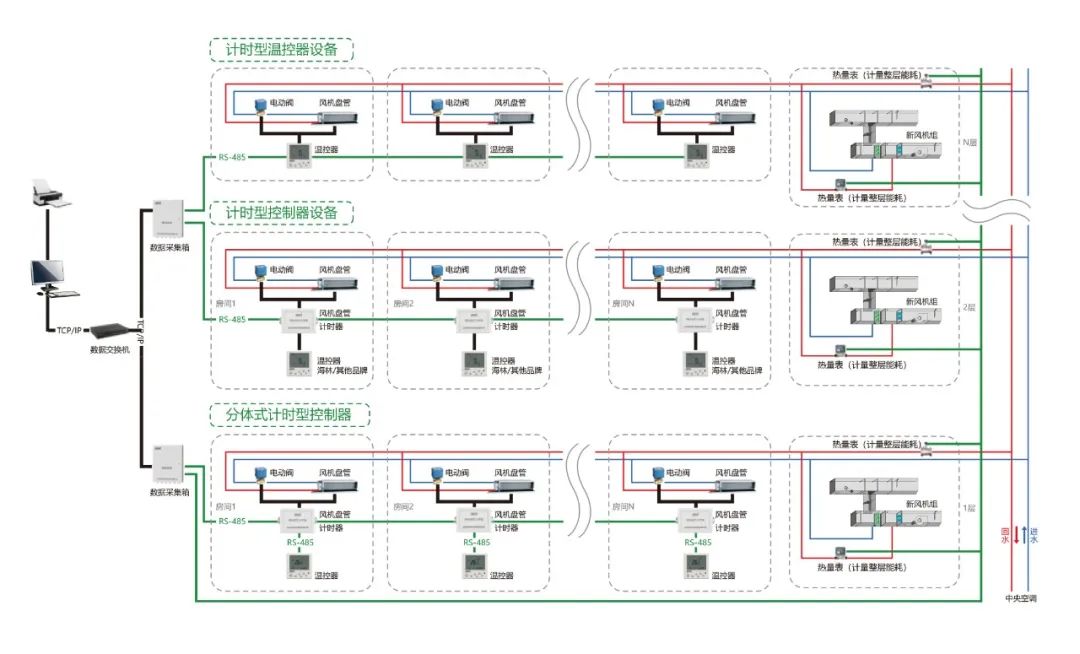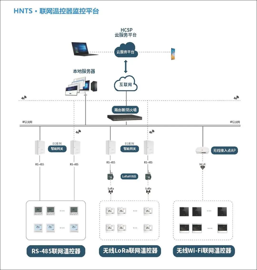 海林HNTS末端溫控器集控系統(tǒng)集自動化控制技術(shù)、計算機網(wǎng)絡技術(shù)于一體,可同時集中或獨立對多臺末端設(shè)備的啟停、水閥的開閉及溫度設(shè)置進行控制。有三種聯(lián)網(wǎng)集控方式:RS-485 有線方式、 LoRa 無線方式和 Wi-Fi 無線方式。