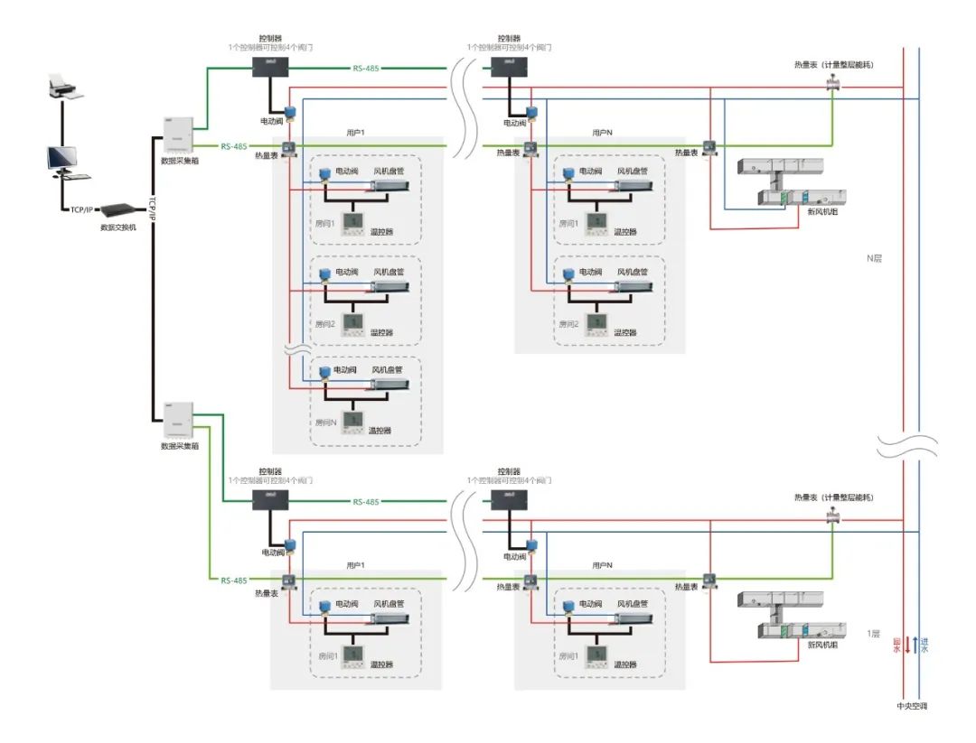 系統(tǒng)通過測量流經(jīng)空調(diào)設(shè)備的冷(熱)媒體(一般采用水作為載體)流量和溫差?得出每一個用戶的實際消耗冷(熱)量、公共區(qū)域消耗冷(熱)量以及整座大樓的總消耗冷(熱)量?根據(jù)整個空調(diào)系統(tǒng)的用電量準確地計算出每個用戶使用的空調(diào)費用。適用于較大空調(diào)空間的計費。