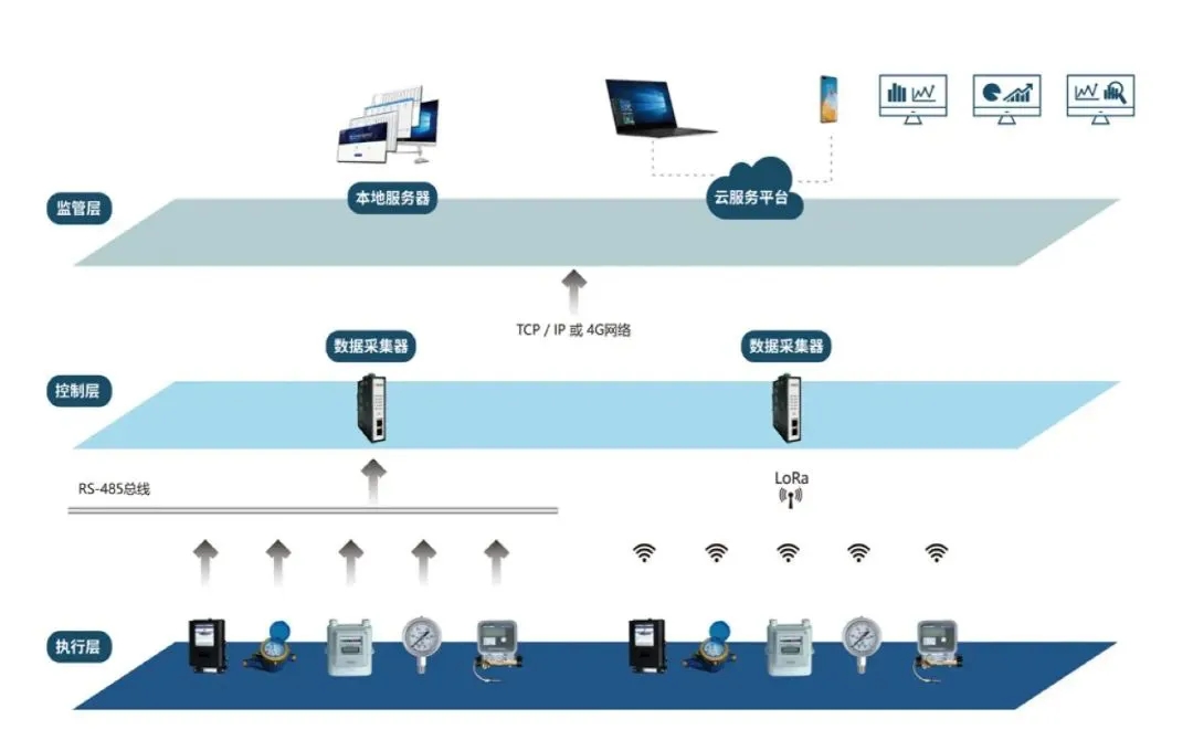 通過 RS-485 總線或 LoRa 通訊模塊,將計量表具的數(shù)據(jù)收集到智能網(wǎng)關,在施工布線困難的情況下,采用 LoRa 無線通訊模塊,免去復雜的施工布線,將計量表具的數(shù)據(jù)簡單有效地傳輸?shù)街悄芫W(wǎng)關。